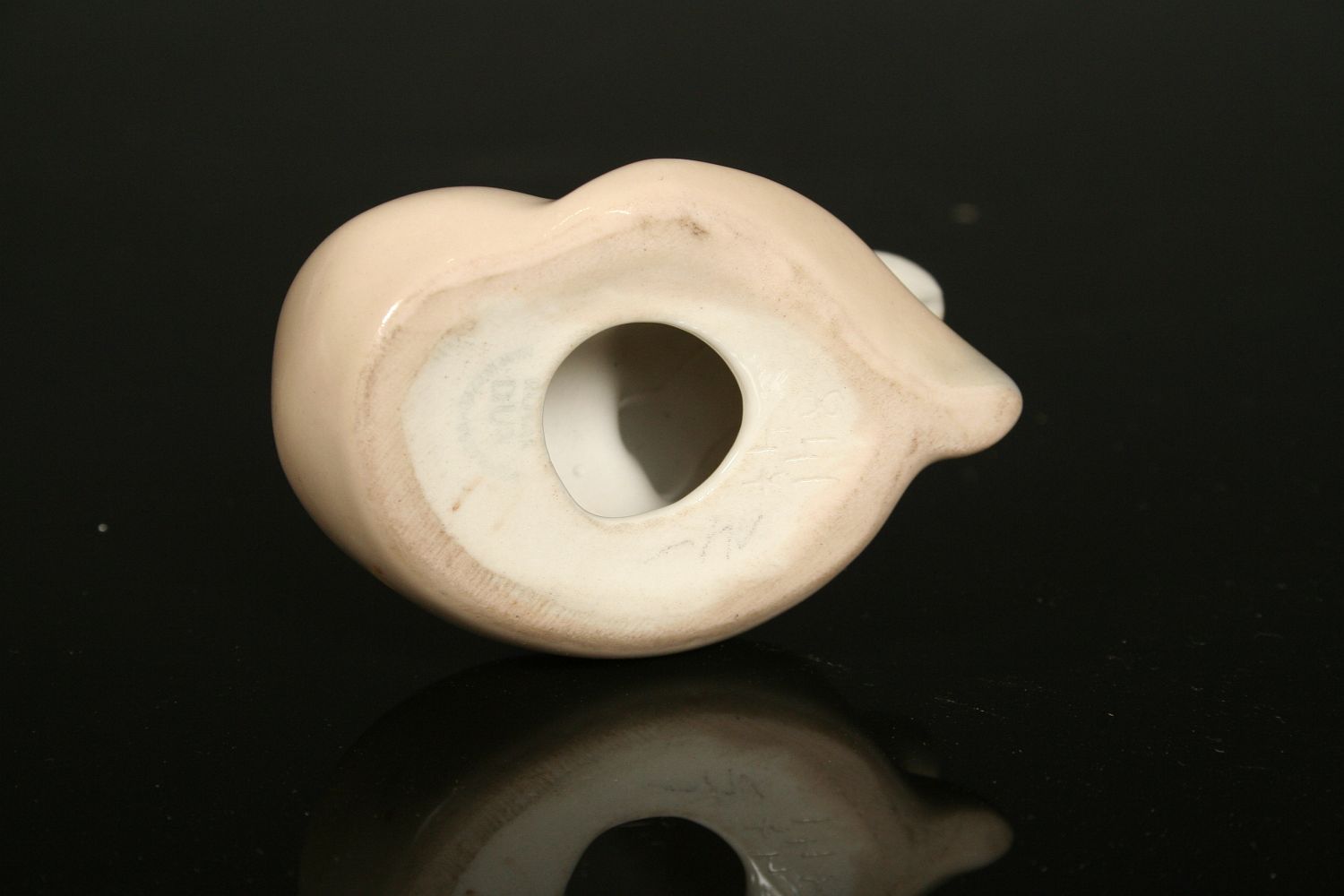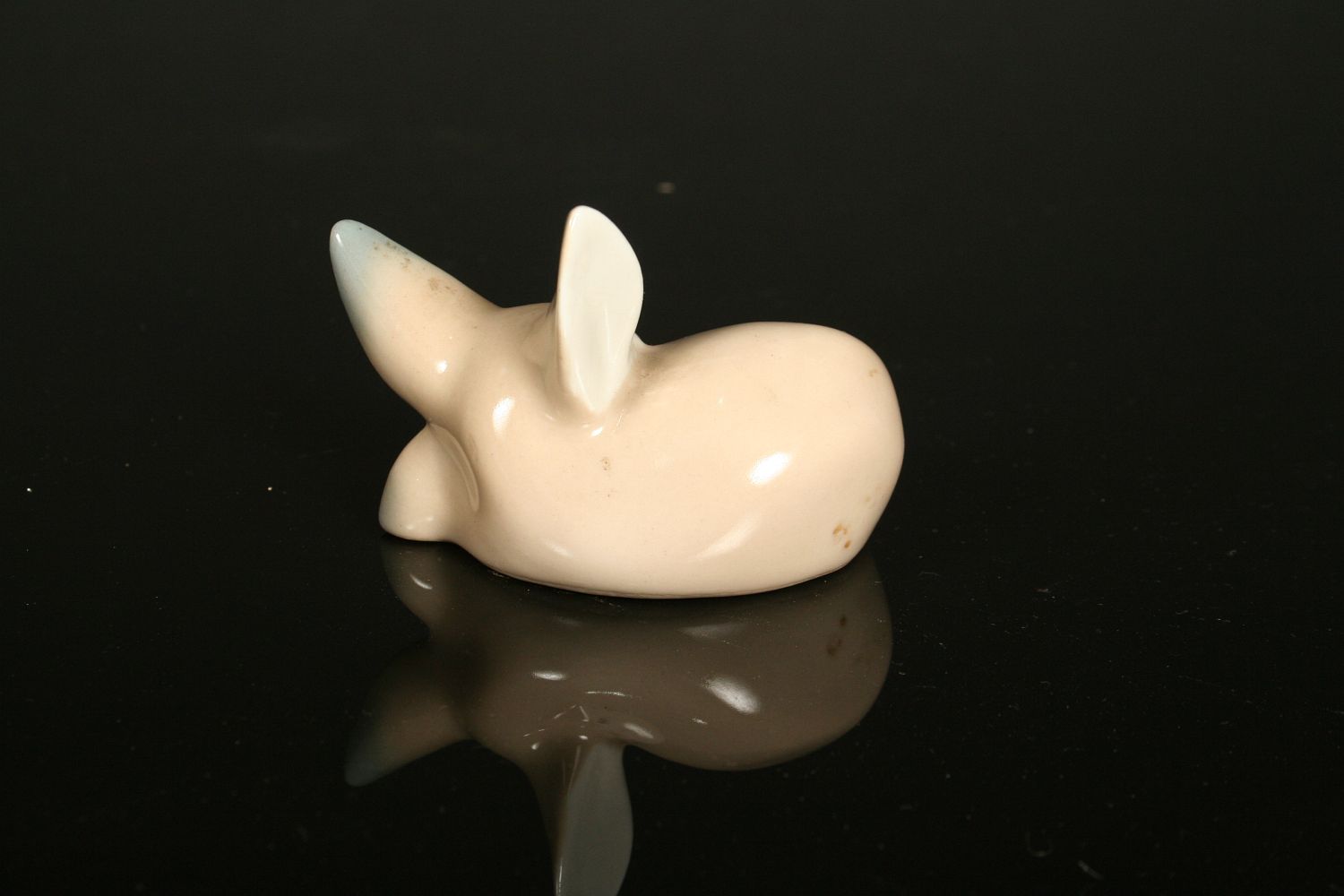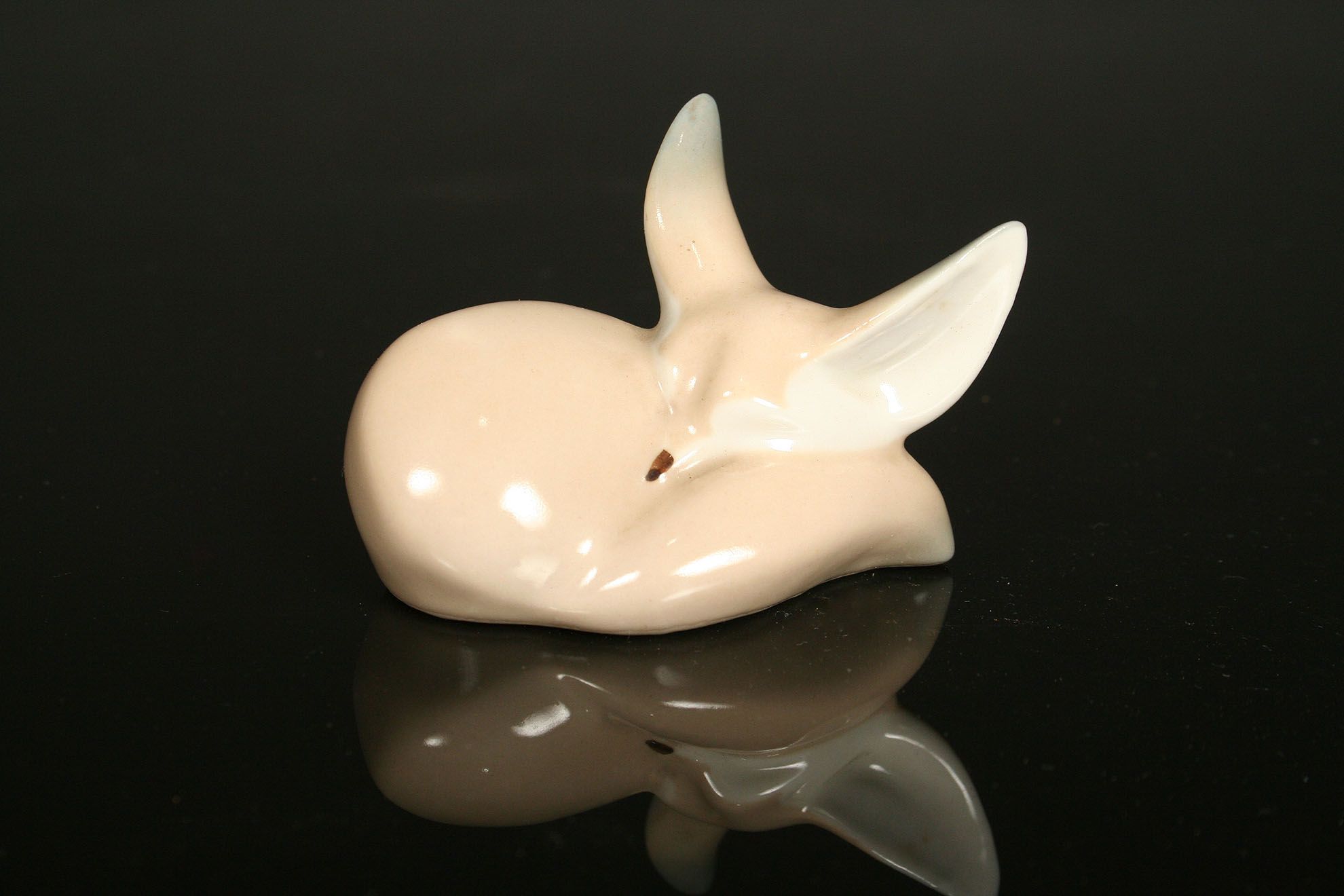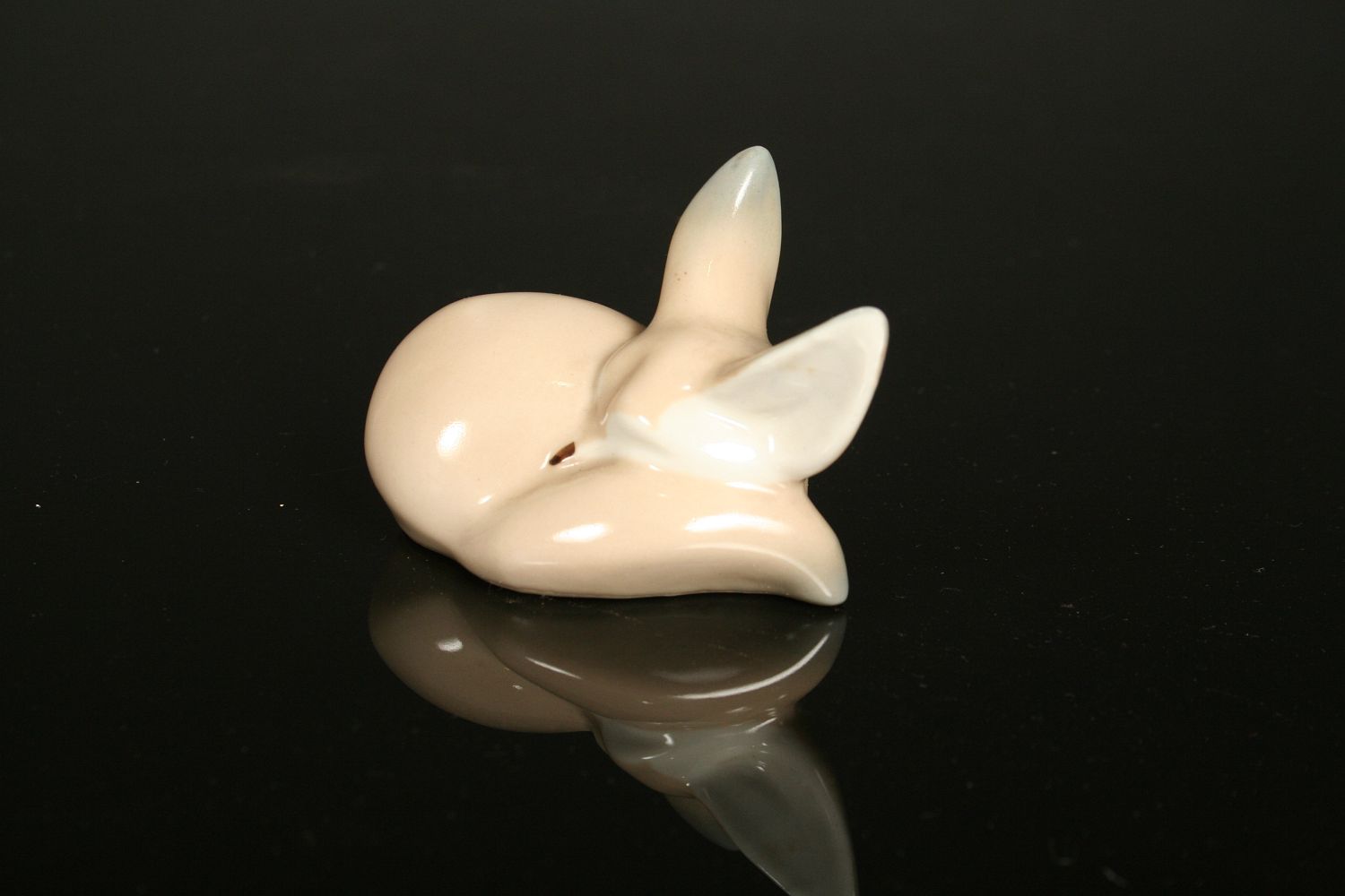 ležící schoulená liška, bílý bílý malovaný porcelán pod glazurou, stylizované provedení, značená na dně starou tištěnou značkou Royal DUX Duchcov 60. léta 20. století, koncem 70. let se již tato značka nepoužívala, 5,5 x 7,5 cm