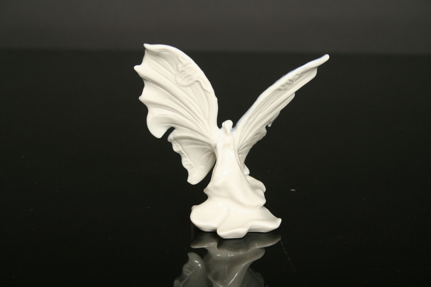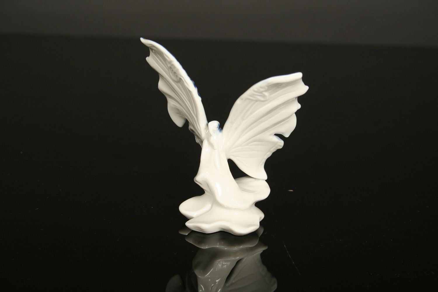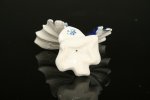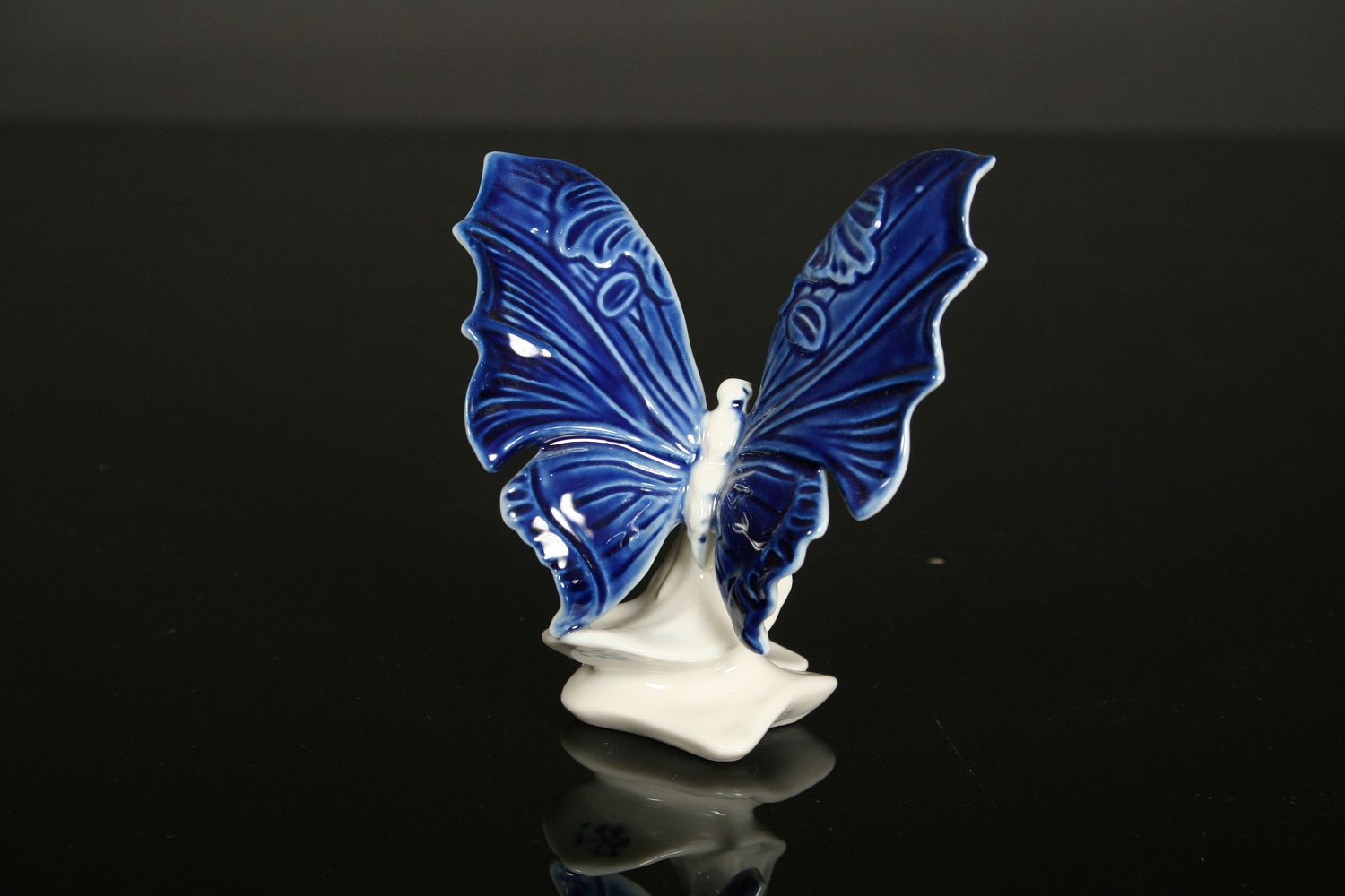 porcelánová soška motýla na čtyřlístku, bílý porcelán malovaný kobaltovou modří, značeno na spodní straně Volkstedt Karl ENS, 9 cm