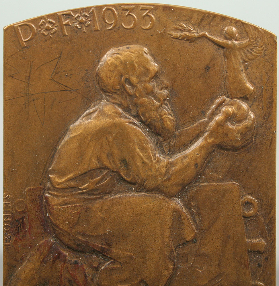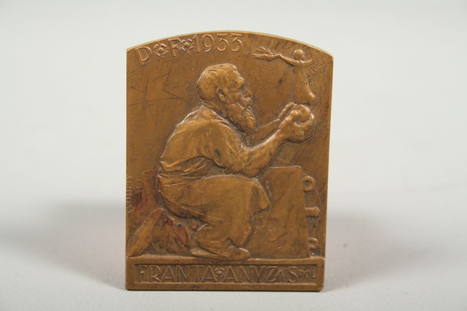 bronzová plaketa, novoročenka Franty Anýže z roku 1933, klečící slévač zprava drží sošku Niké, autor Josef Šejnost (1878 - 1941), značeno na straně Šejnost, jednostranná 57x44 mm