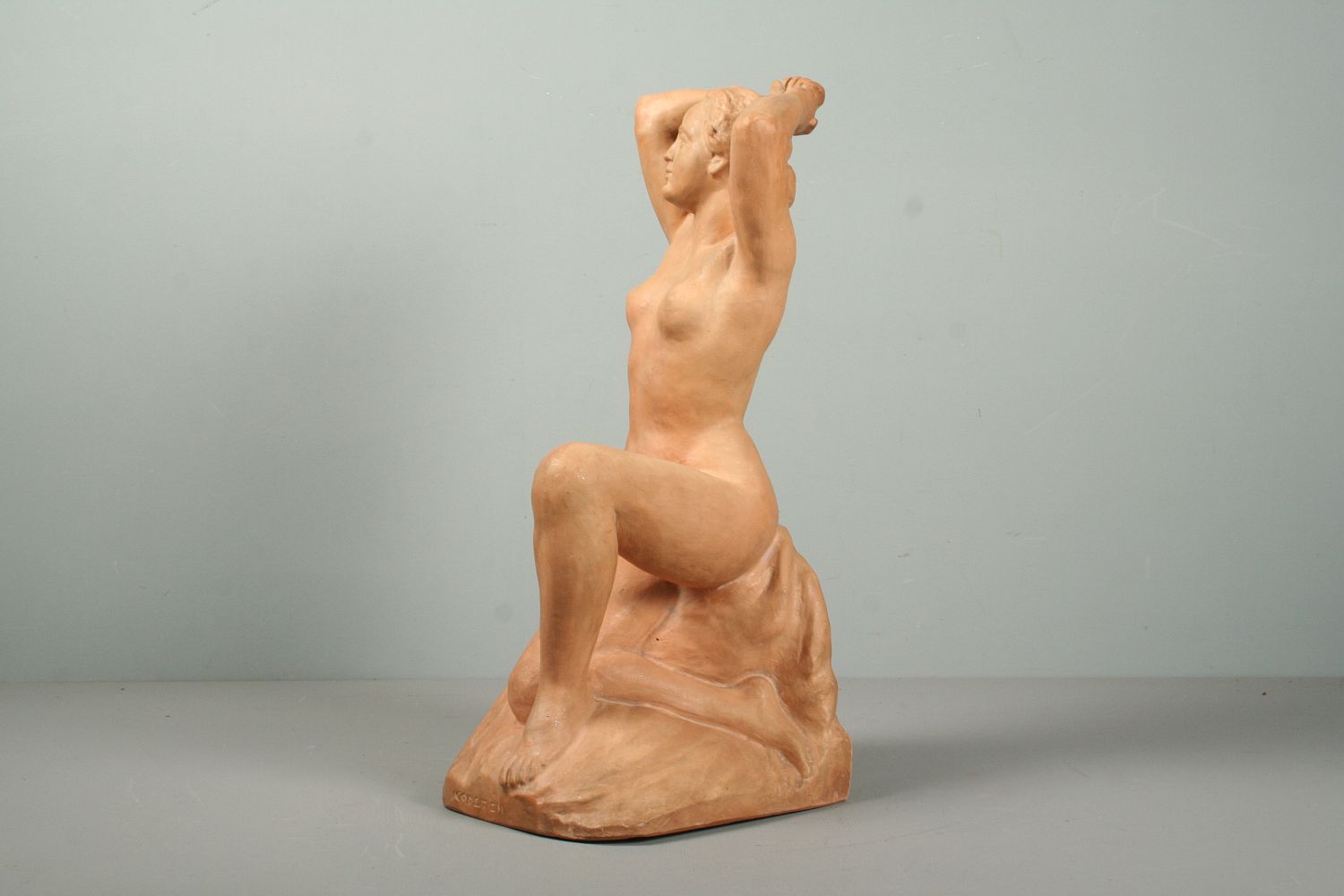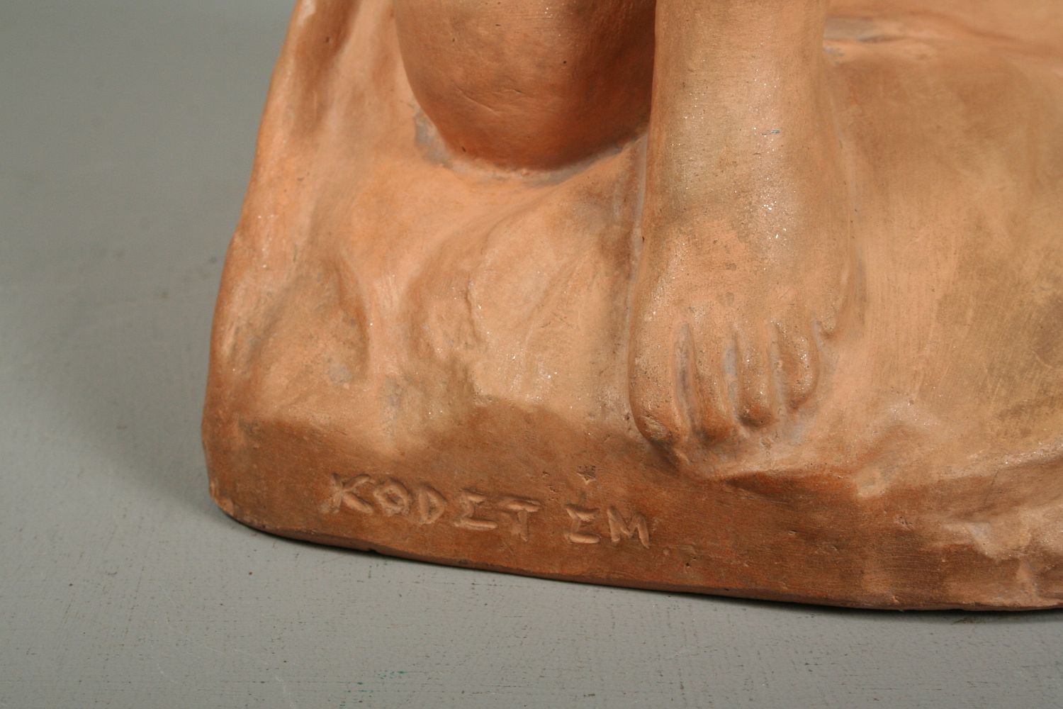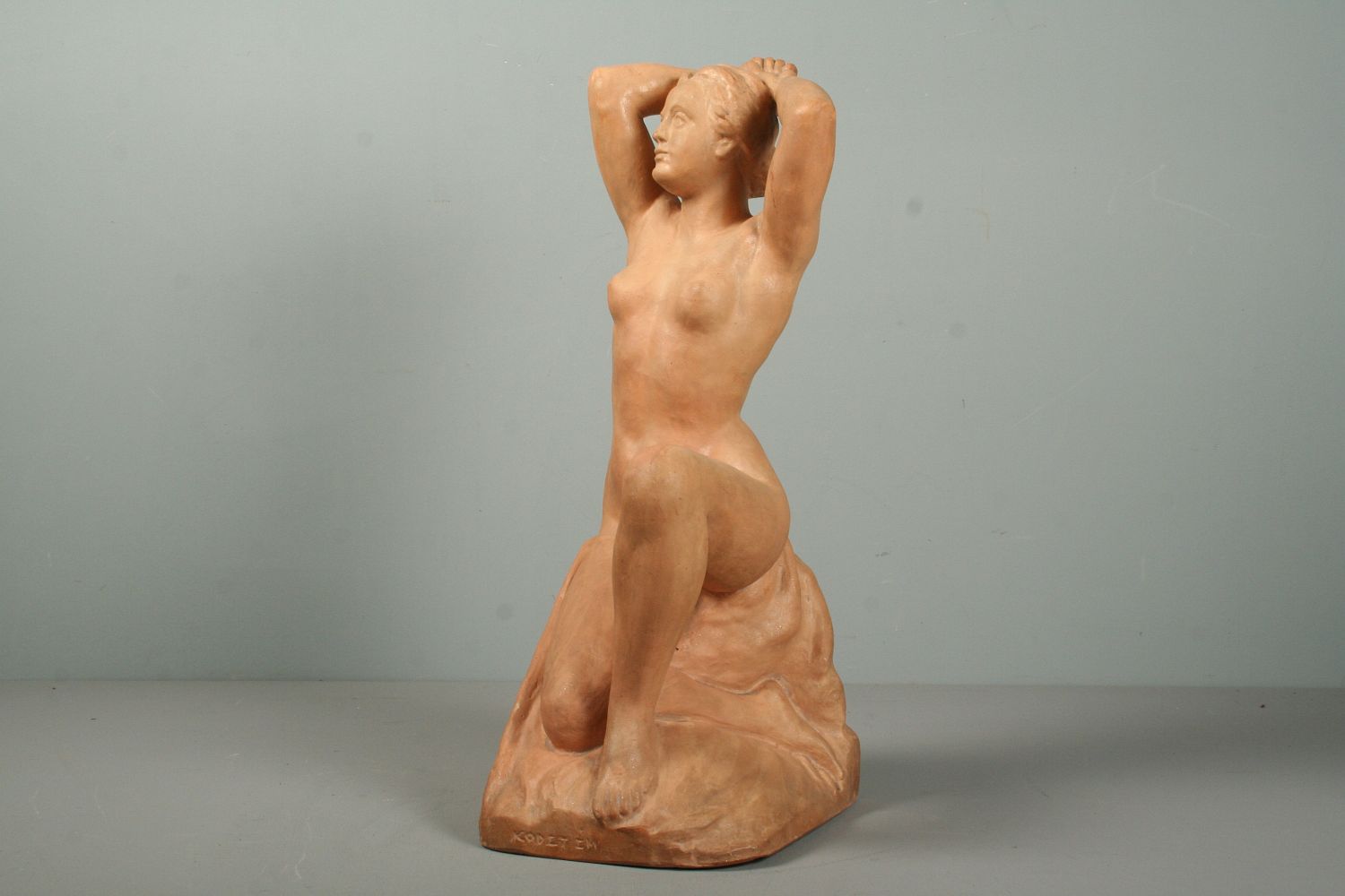 socha sedící nahé dívky, pálená hlína terakota, 42 cm, autor Julian Emanuel Kodet, podepsáno dole na soklu Em. Kodet