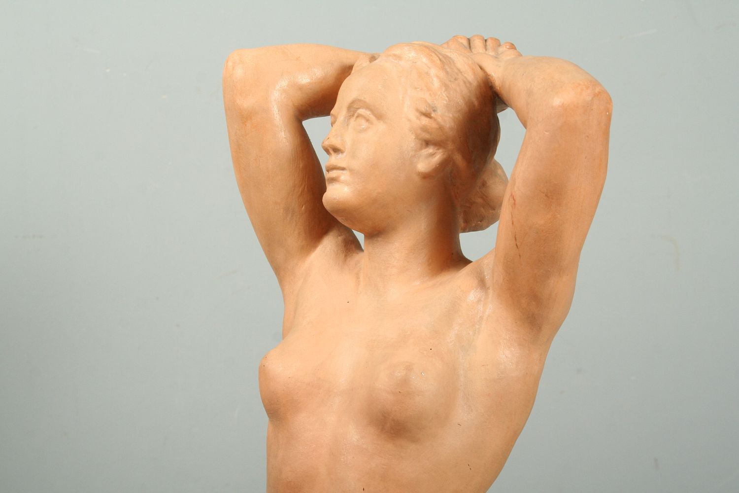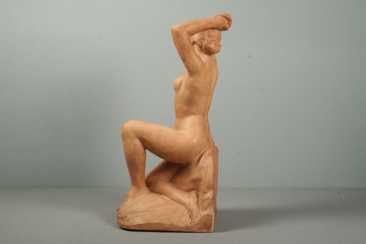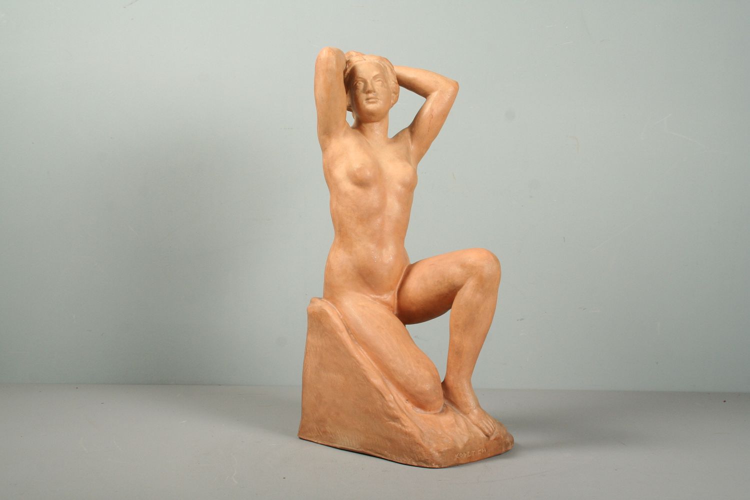 socha sedící nahé dívky, pálená hlína terakota, 42 cm, autor Julian Emanuel Kodet, podepsáno dole na soklu Em. Kodet
