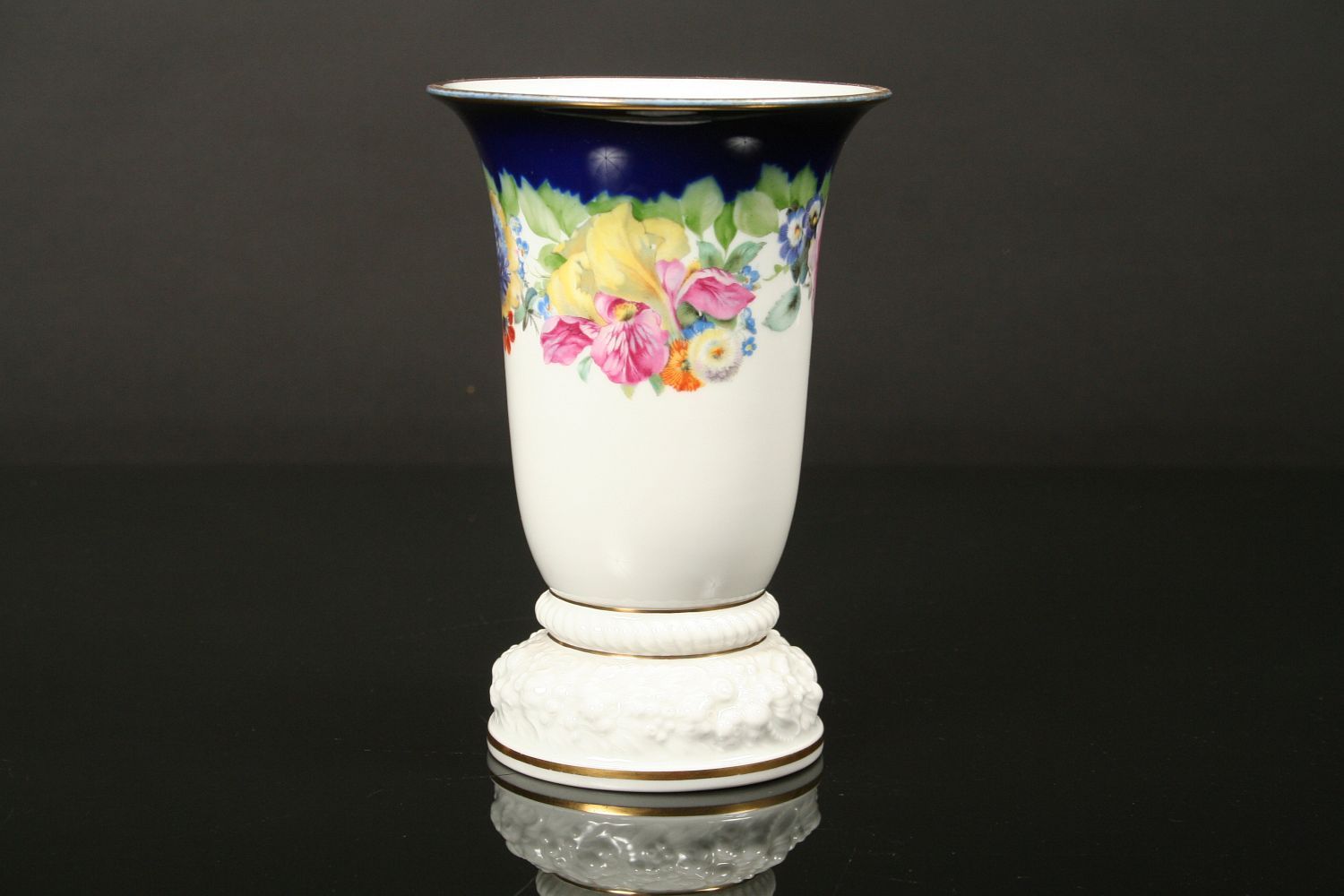 luxusní váza s květy, bílý glasovaný porcelán, dekorovaný kobaltem a květy, podstava plastický reliéf se zlacenými linkami, značeno na dně tištěnou značkou Rosenthal, Model von Ph. Rosenthal, 1. polovina 20. století, 17,5 cm