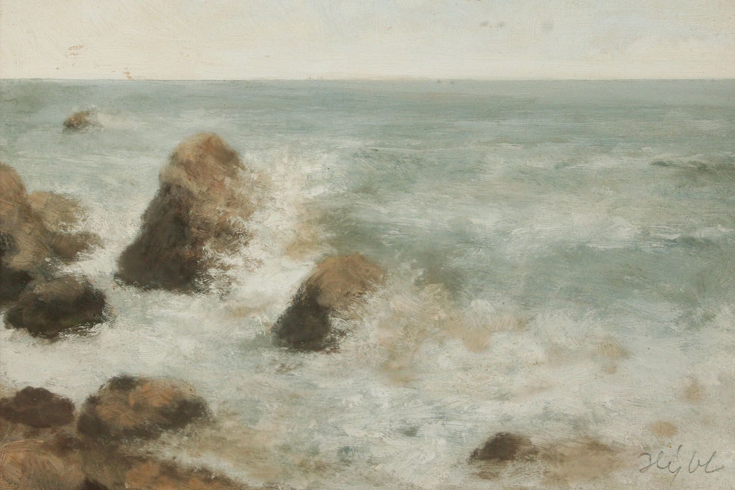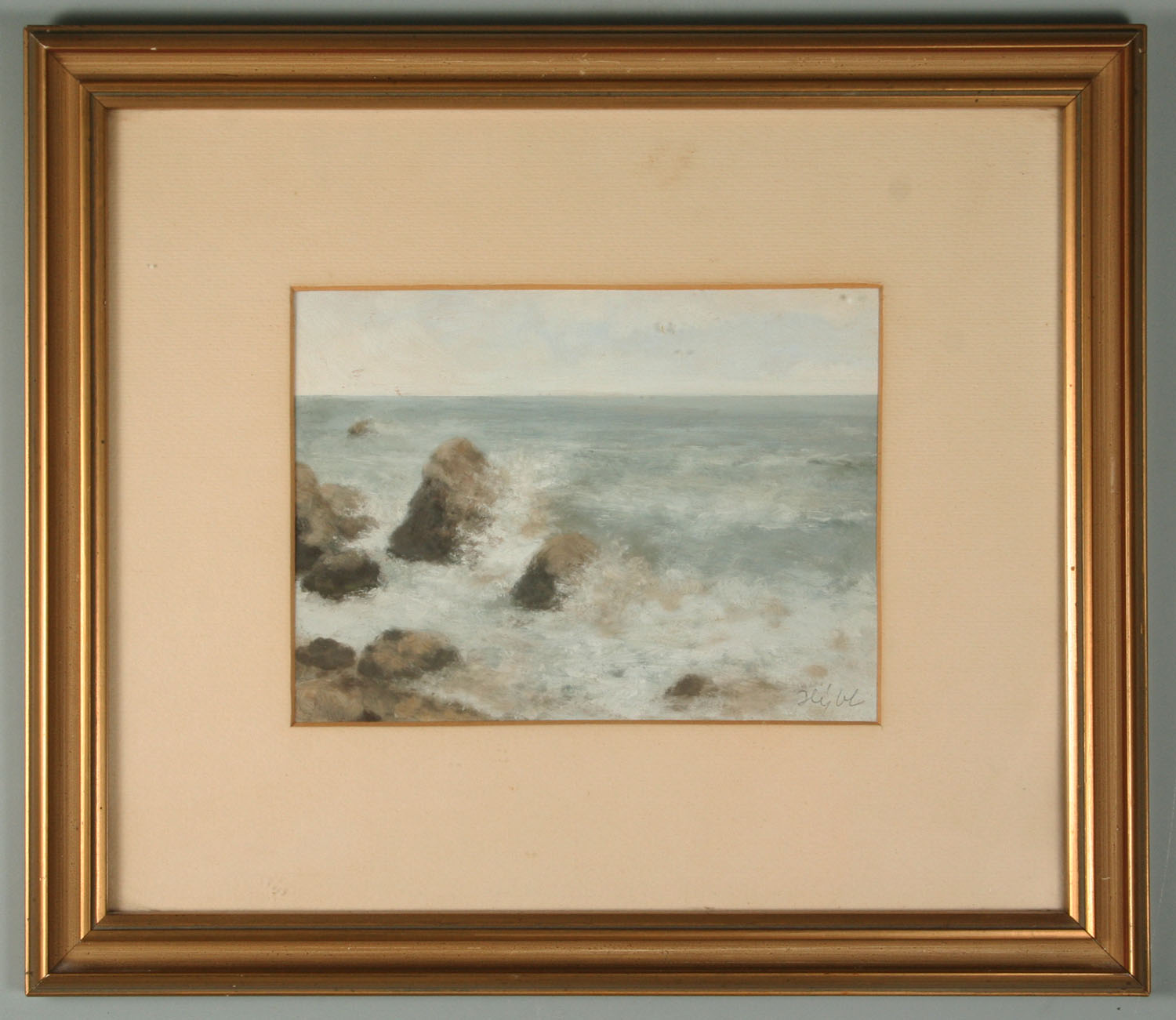 obraz moře s příbojem, olej na lepence 16 x 21 cm s rámem 35 x 41 cm, autor Karel Hýbl, podepsáno vpravo dole Hýbl, rámováno v původní paspartě a rámu pod sklem