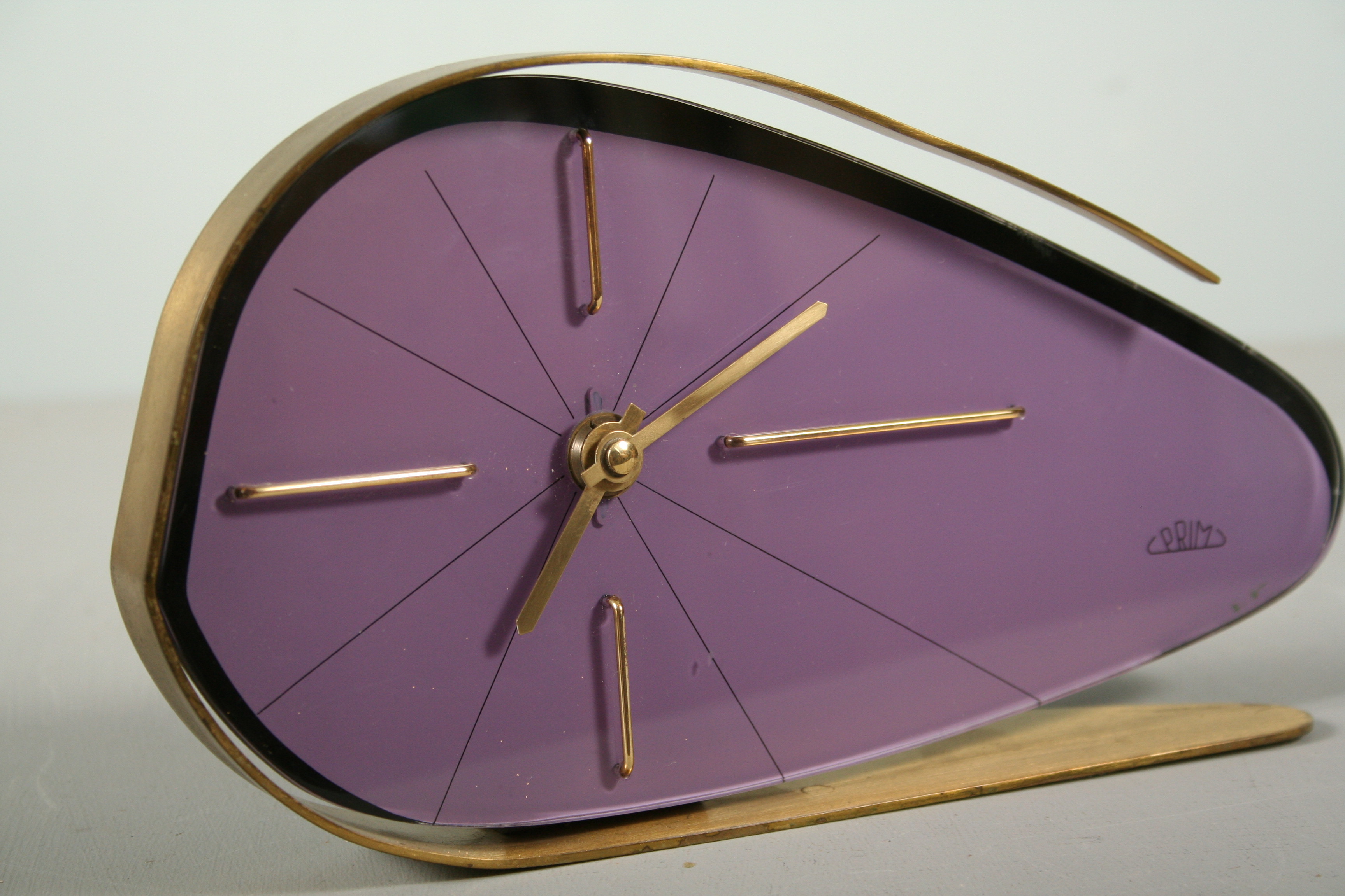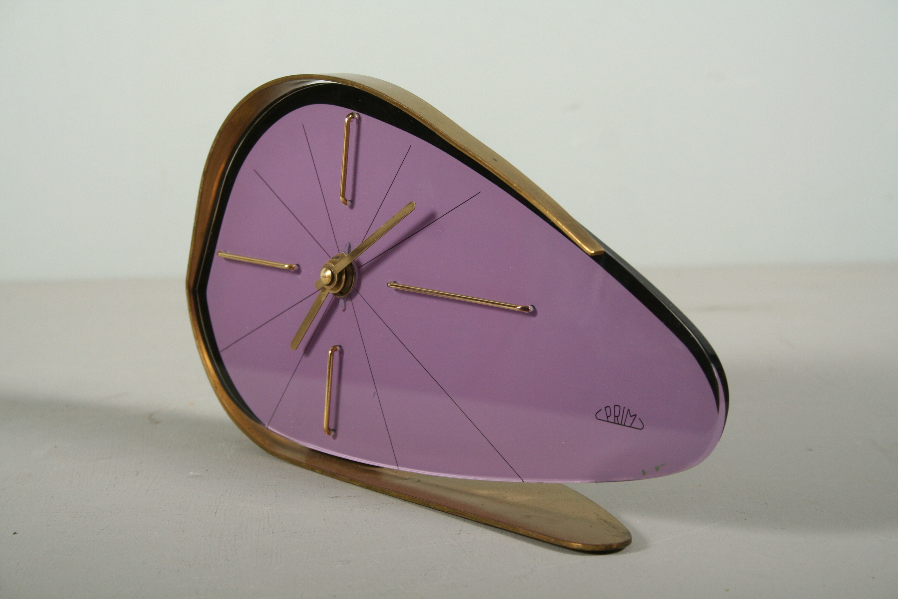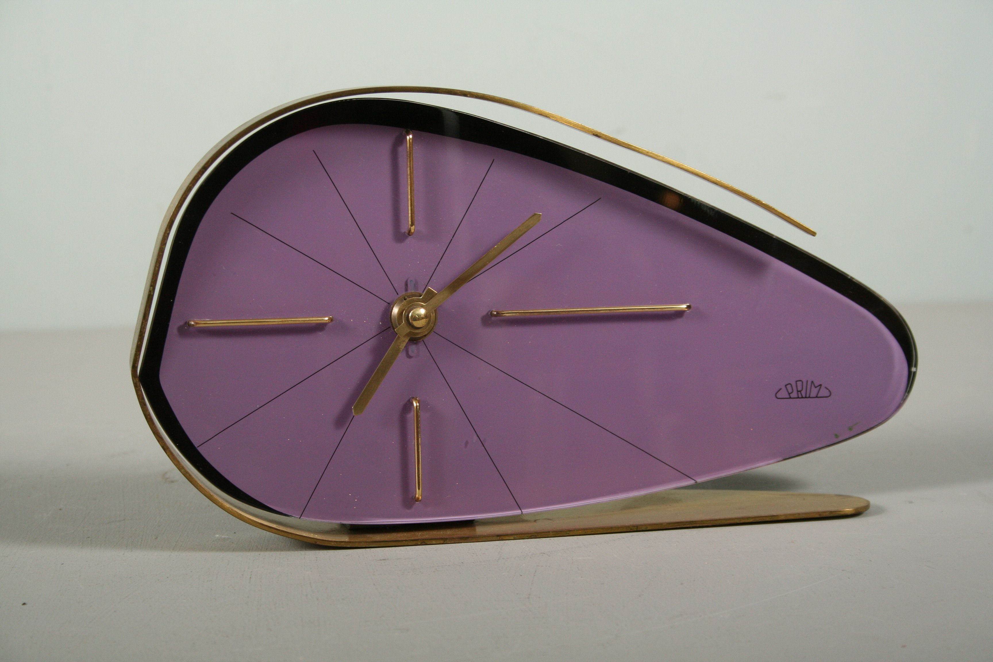 stolní hodiny značky Prim v atraktivní fialové barvě s mosaznými prvky, výroba Chronotechna Šternberk v 60. letech 20. století v duchu výstavy EXPO 58 Brusel, 14 x 25,5 cm, hodinový stroj je vyčištěn zkontrolován hodinářem