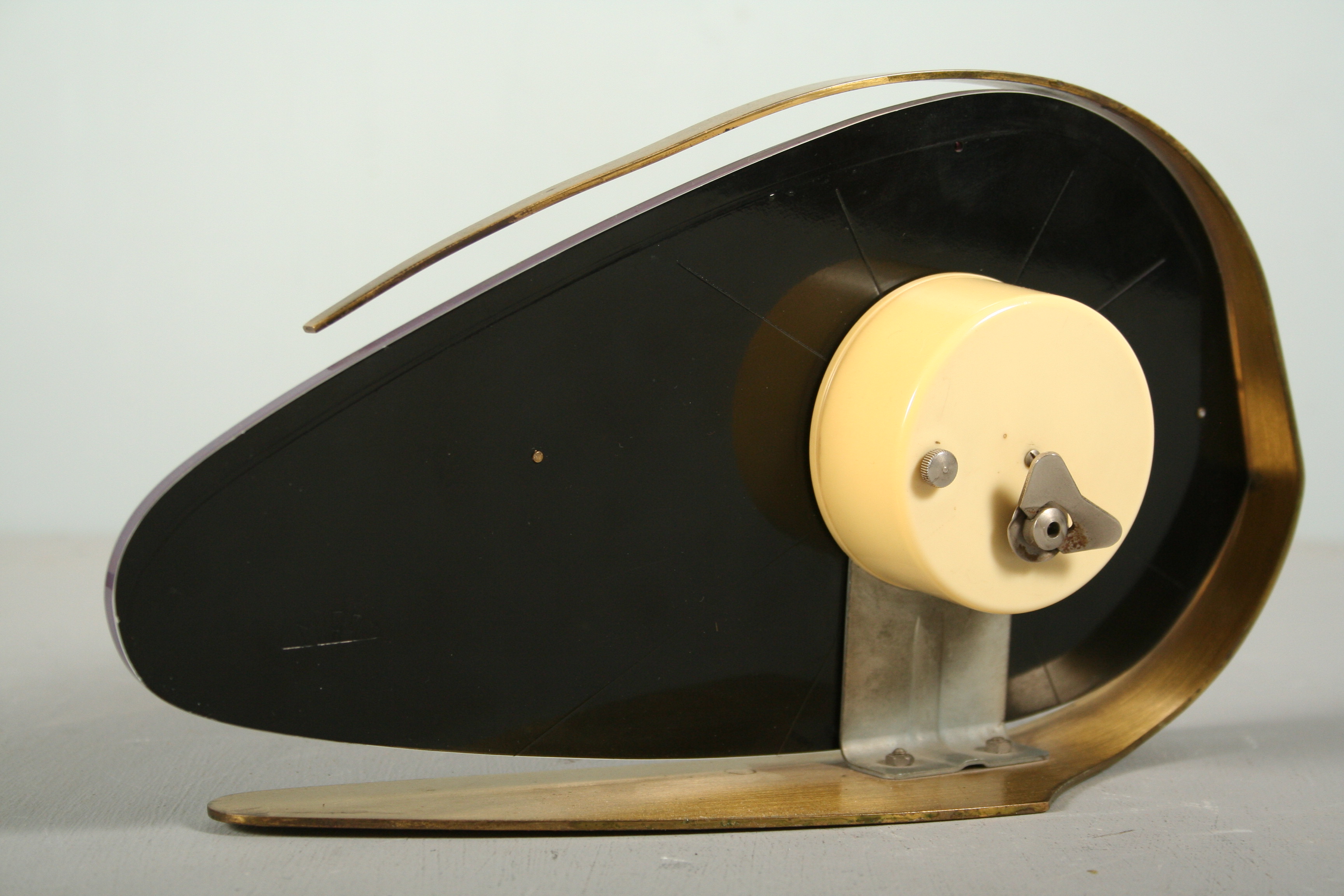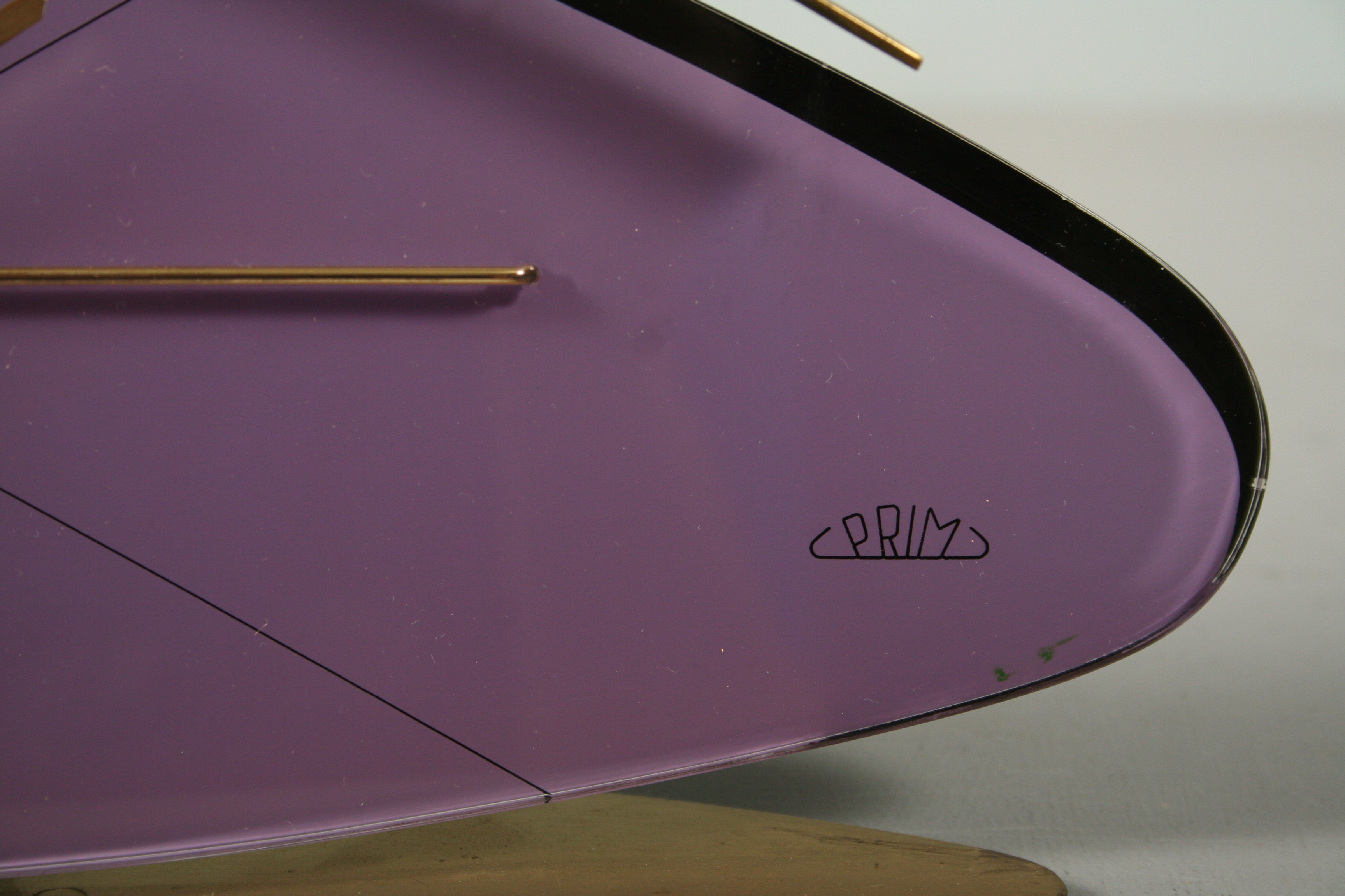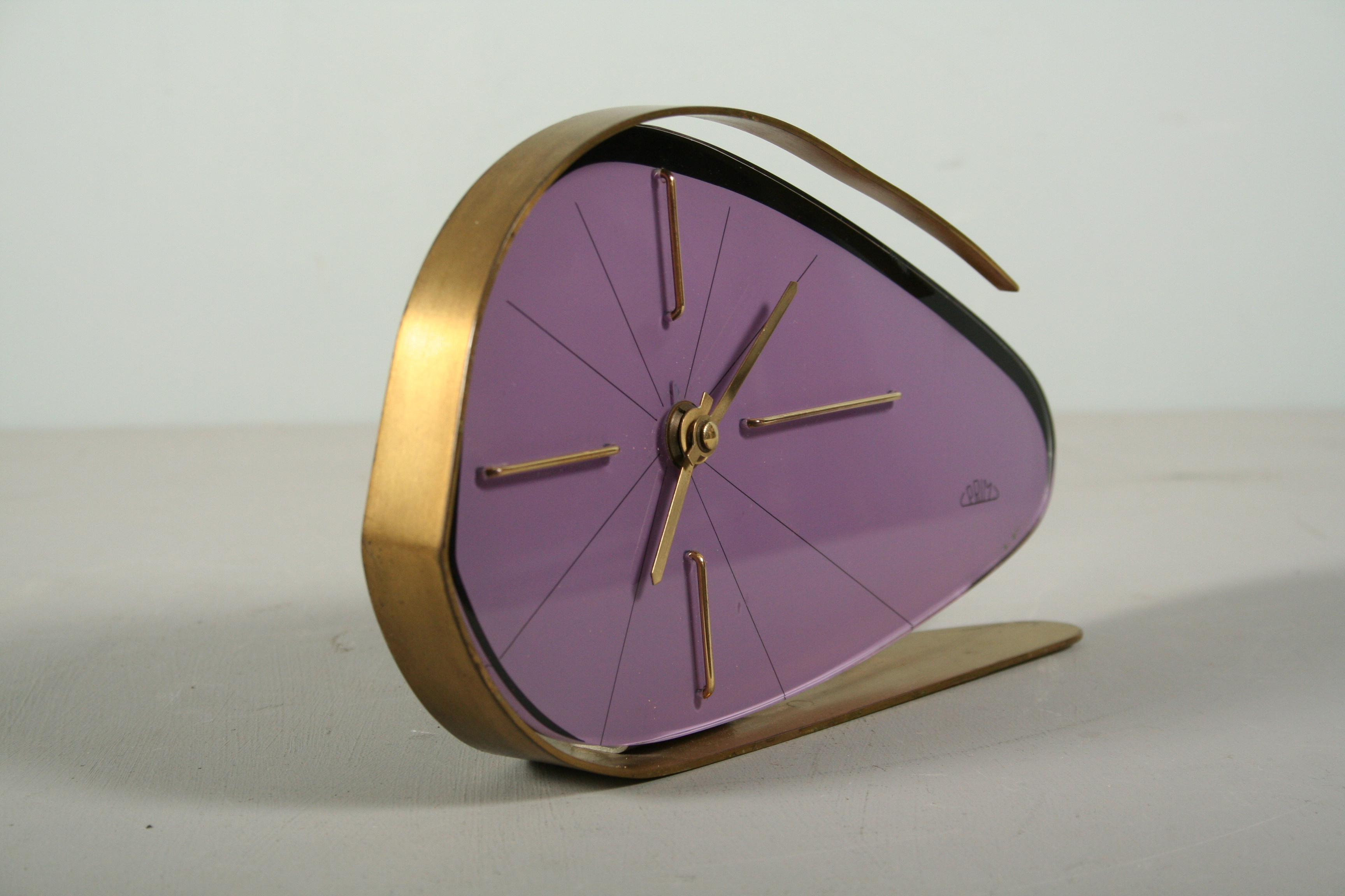stolní hodiny značky Prim v atraktivní fialové barvě s mosaznými prvky, výroba Chronotechna Šternberk v 60. letech 20. století v duchu výstavy EXPO 58 Brusel, 14 x 25,5 cm, hodinový stroj je vyčištěn zkontrolován hodinářem