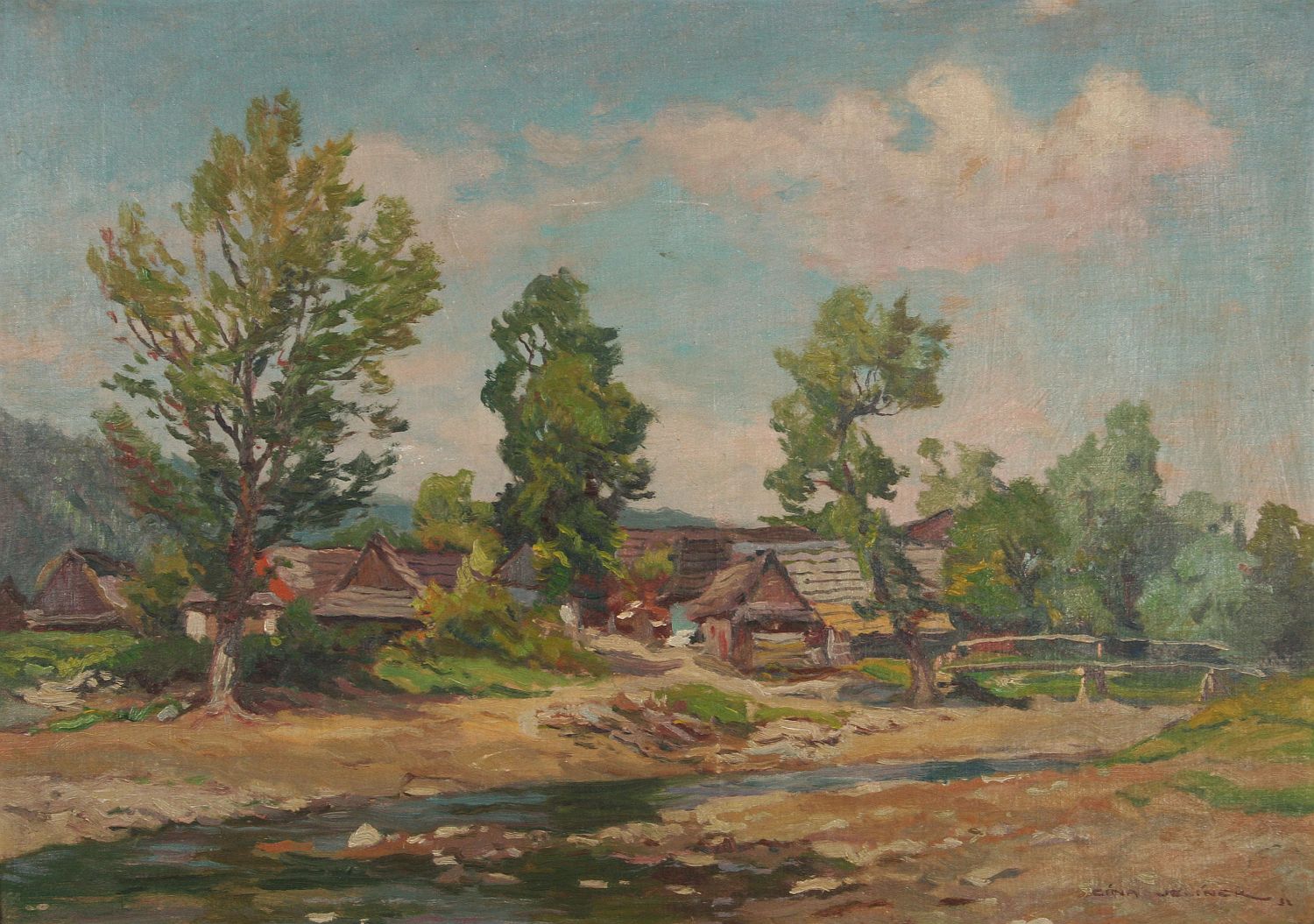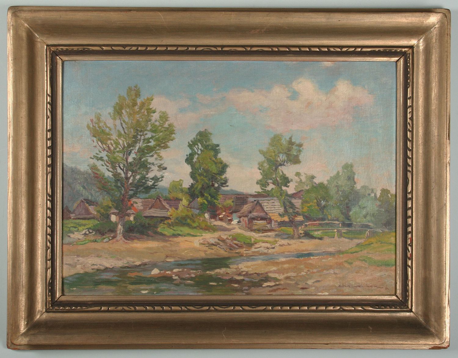 obraz letní krajiny patrně z Vysočiny s vodou a chloupkami, olej na plátně lepeném na kartonu, 35 x 50 cm s rámem 51 x 66 cm, autor Cína Jelínek, podepsáno vpravo dole Cína - Jelínek 32, rámováno v původním rámu