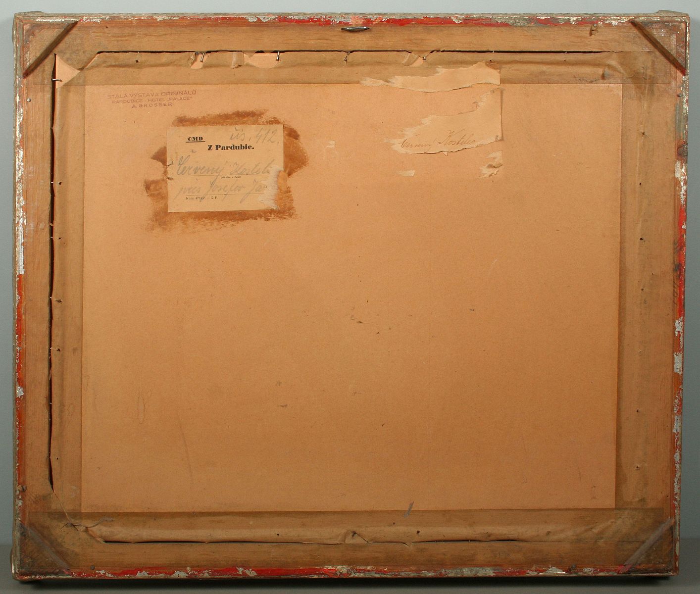 obraz zimní krajiny z Vysočiny s chlupami, olej tempera na papíře, ve výřezu 31 x 41 cm, s rámem 54 x 63 cm, autor Rudolf Hanych, podepsáno vpravo dole R. Hanych, rámováno v půvdní paspartě a zdobeném rámu pod sklem