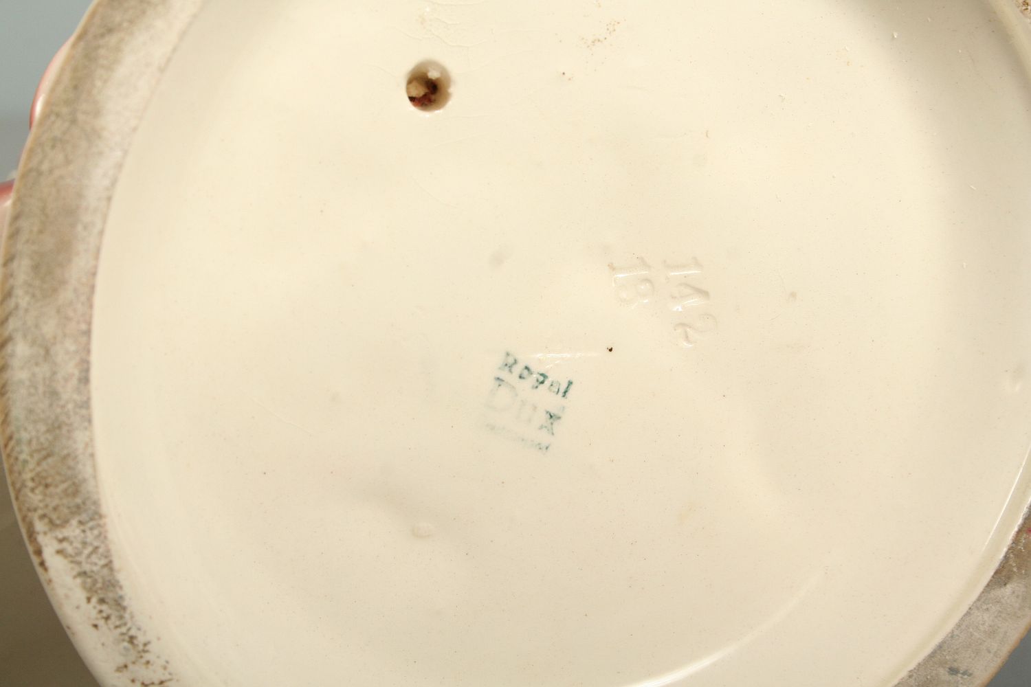 dáma v kloboučku a šatech s paraplíčkem v ruce, malovaná a glasovaná keramika, elegantní provedení, značeno na dně zeleným razítkem Royal DUX Deutschland, 31 cm