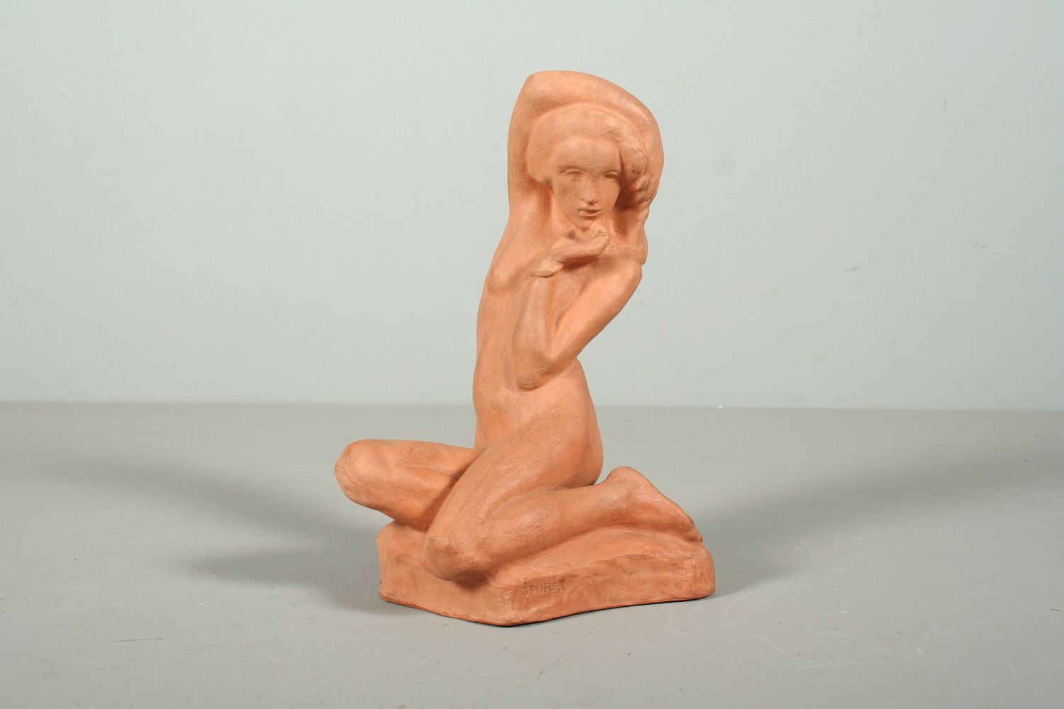 socha melancholické dívky, pálená hlína terakota, autor Jan Štursa, ze spodní strany zbytky tužkou ŠTURSA, podepsáno na podstavě ŠTURSA, 21,5 cm