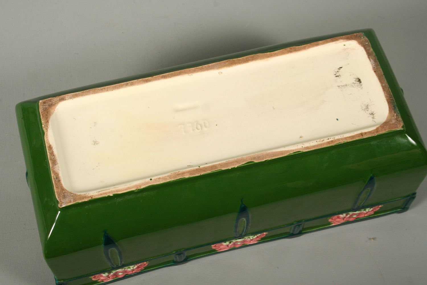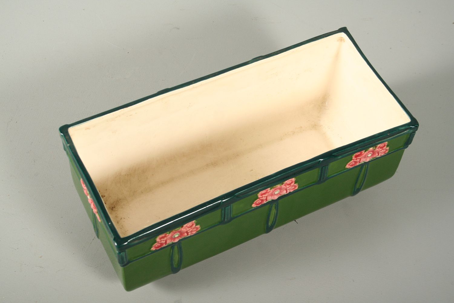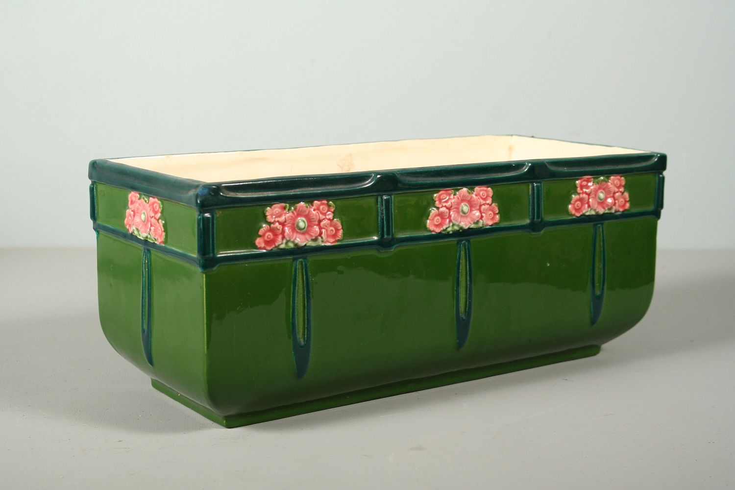 secesní keramický květináč obdelníkového tvaru na stranách s barevným dekorem květin a secesních ornamentů, na dně značený Eichwald, tlačené číslo 7760, 14 x 15 x 33 cm