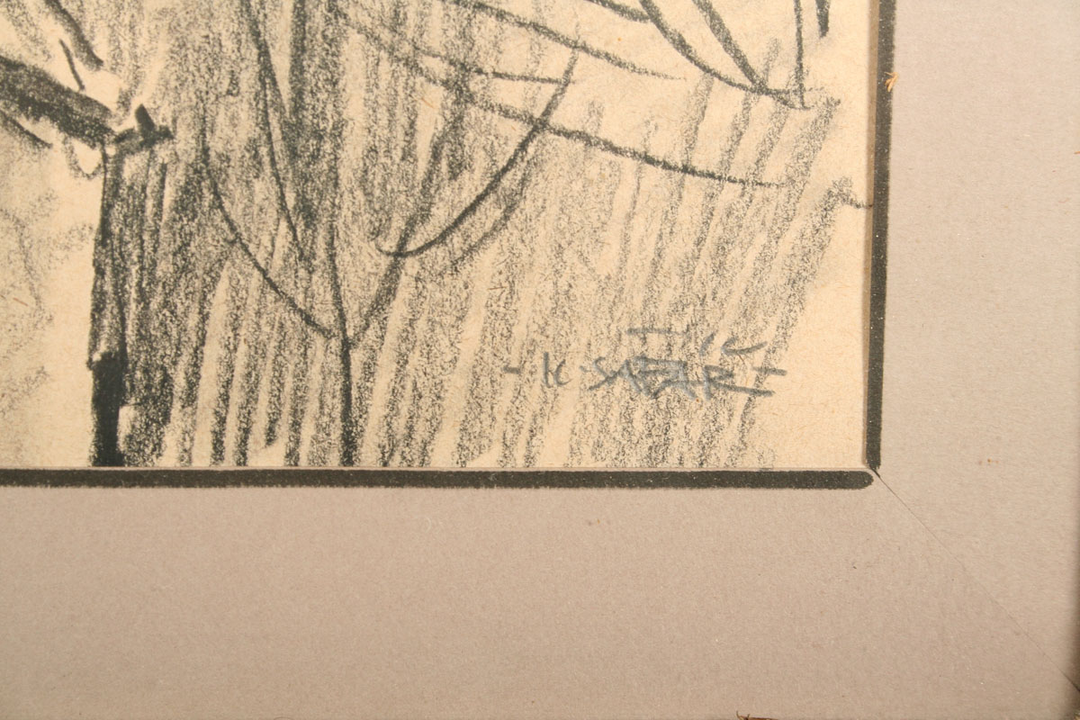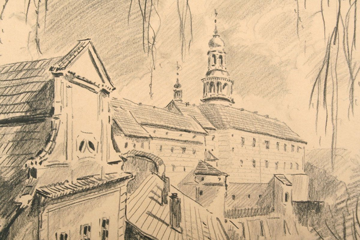 pohled na náchodský zámek od západu, kresba na papíře, ve výřezu 40 x 40 cm s rámem 56 x 56 cm, autor Karel Šafář, podepsáno vpravo dole K.Šafář ze zadu autorský přípis s datací 1980 a určením, rámováno v paspartě a rámu pod sklem