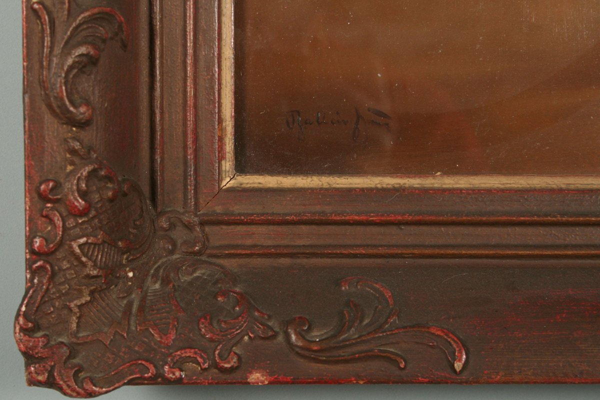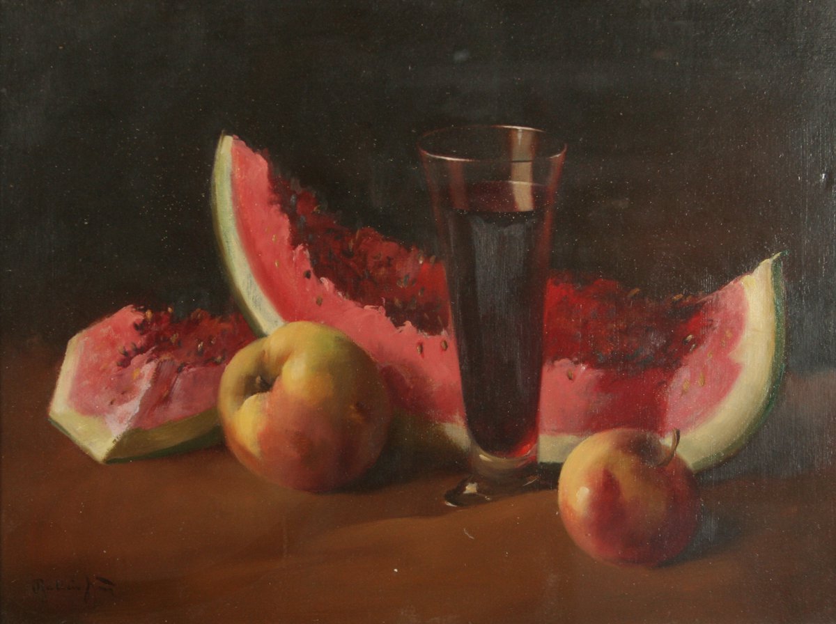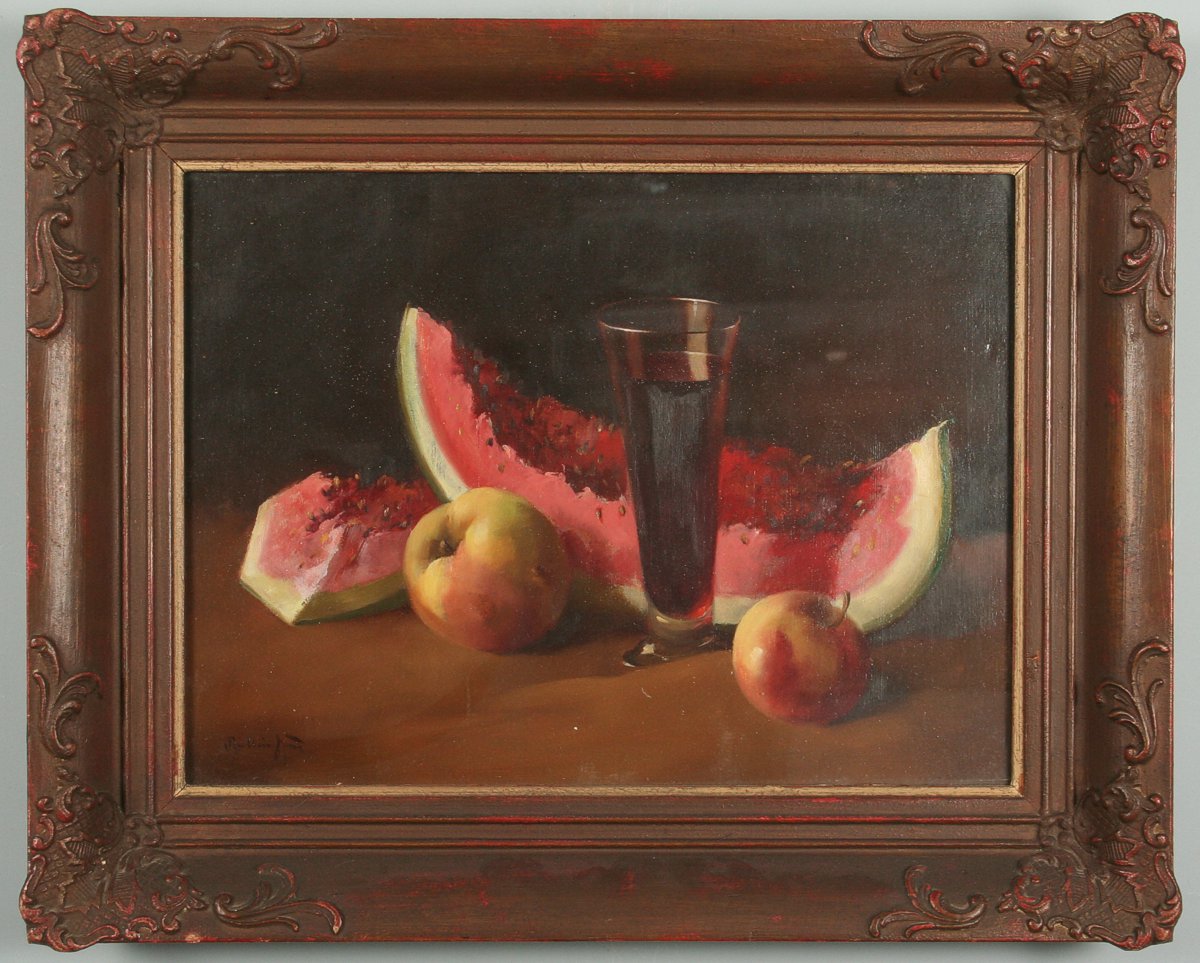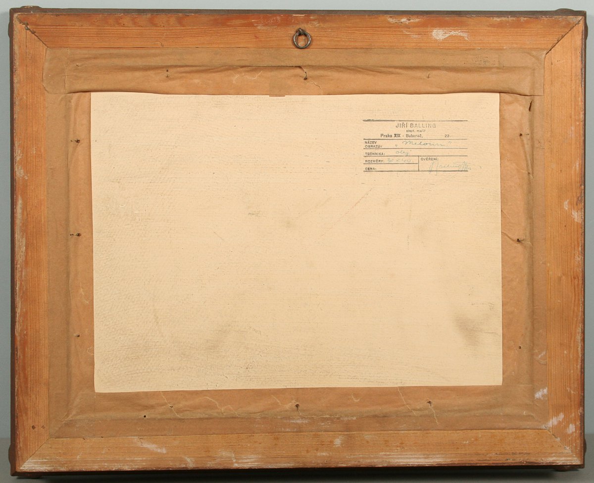 zátiší s vínem, melounem a jablky, olej na kartonu 30 x 40 cm s rámem 43 x 53 cm autor Jiří Balling, podepsáno vlevo dole Balling Jiří, na zadní straně autorské razítko s přípisem "meloun", rámováno v původním zdobeném rámu pod sklem