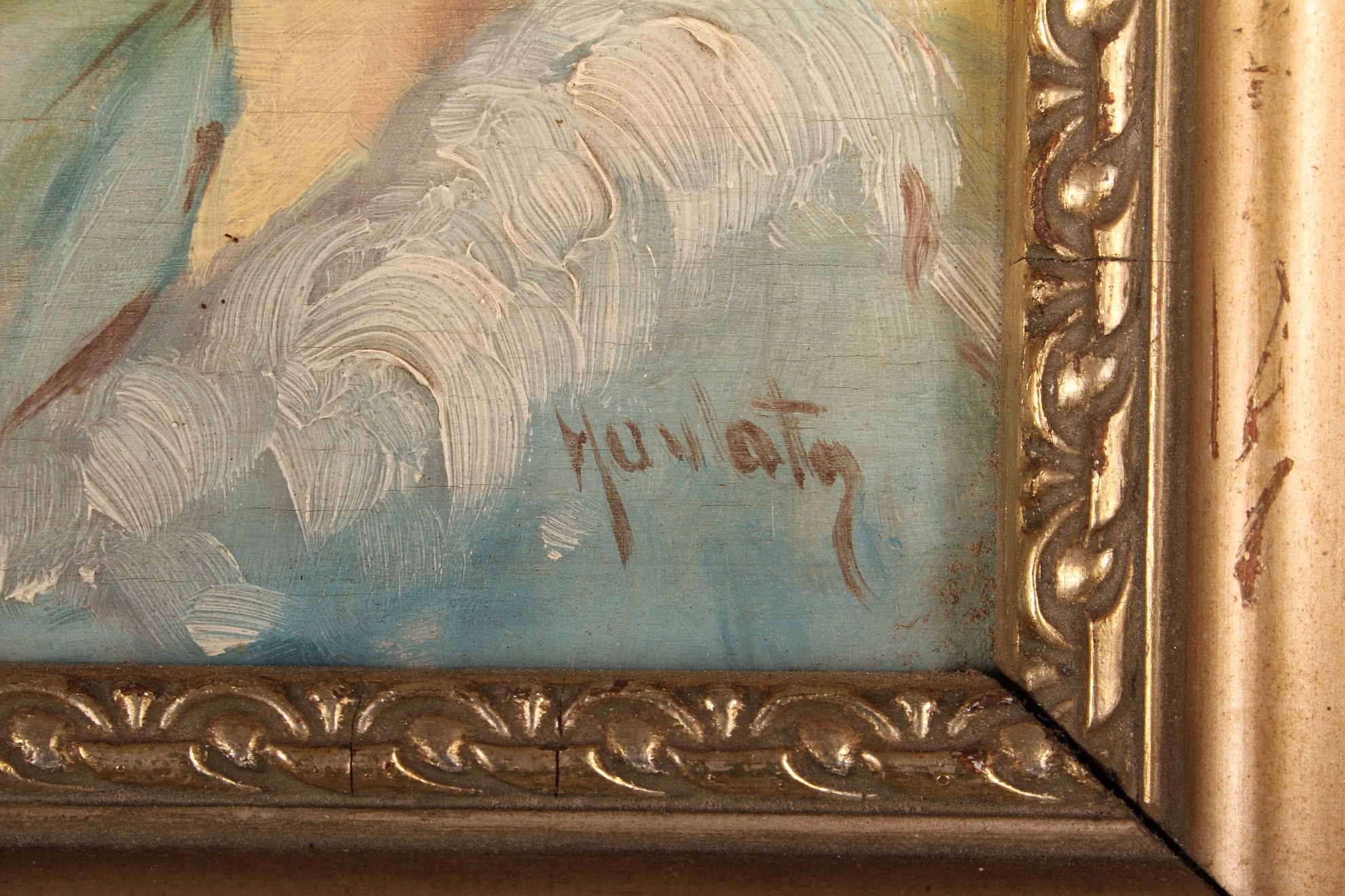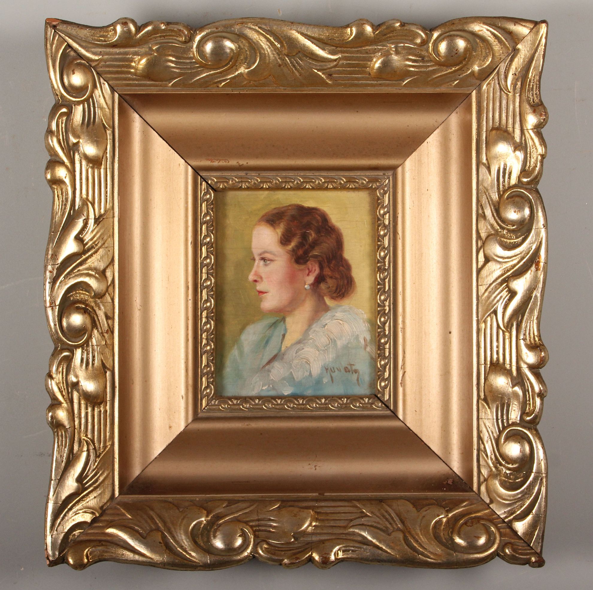portrét dívky, olej na dřevěné desce ( překližce) 15 x 13 cm s rámem 35 x 32 cm, autor Karel Havlata, podepsáno vpravo dole Havlata, rámováno v původním zdobeném rámu
